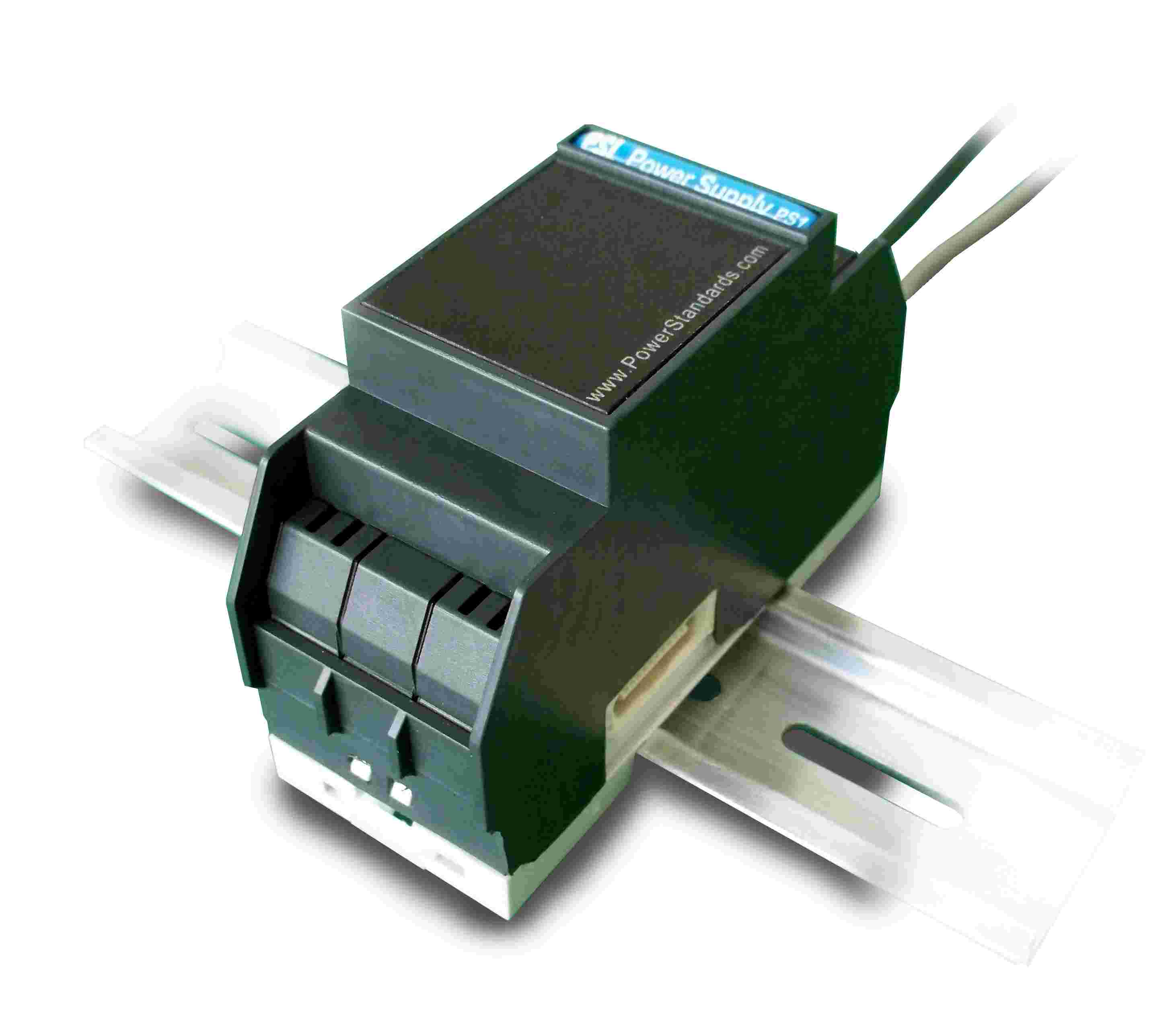 | El PQube se puede alimentar con una fuente de continua de 24V hasta 48V,o bien con corriente alterna de 24V. Este módulo PS1 es una fuente de alimentación que funciona en el rango entre 100VAC y 240VAC. |